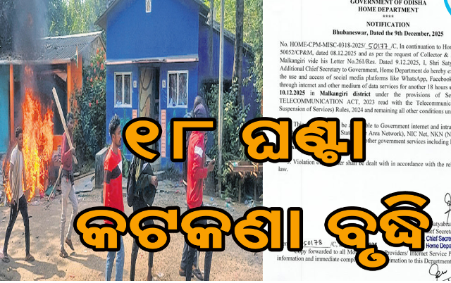 ଭୁବନେଶ୍ବର, ୯/୧୨: ମାଲକାନଗିରିରେ ବଢ଼ିଲା ଇଣ୍ଟରନେଟ୍ କଟକଣା । ଆଉ ୧୮ ଘଣ୍ଟା ଇଣ୍ଟରନେଟ୍ କଟକଣା ବୃଦ୍ଧି କଲା ପ୍ରଶାସନ । ବୁଧବାର ଦିନ ୧୨ଟା ପର୍ୟ୍ୟନ୍ତ କଟକଣା ବୃଦ୍ଧି ନେଇ ସୂଚନା ଜାରି କରାଯାଇଛି । ଜଊଉ ଓ ଜିଲ୍ଲାପାଳଙ୍କ ସହ ଆଲୋଚନା ପରେ ଇଣ୍ଟରନେଟ୍ କଟକଣା ବୃଦ୍ଧି କରାଯାଇଛି । ଗୃହ ବିଭାଗ ଅତିରିକ୍ତ ମୁଖ୍ୟ ଶାସନ ସଚିବ ନିର୍ଦ୍ଦେଶନାମା ଜାରି କରିଛି । ସରକାରୀ, ବ୍ୟାଙ୍କ ଓ ରେଲୱେ ସେବା ପାଇଁ ଇଣ୍ଟରନେଟ୍ କଟକଣା ମନା ।