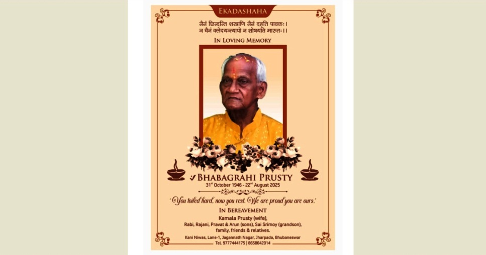 Top Stories Gone from our sight, but forever in our hearts Bhabagrahi Prusty-A Man who lived for others. Tags: Post navigation Previous Previous post: Bhubaneswar lawyer dies after self-immolation; mental health under probeNext Next post: Rayagada CDO Akshay Khemundu wins million hearts through exemplary work Related Posts Thousands throng PM Modi mega roadshow in Odisha capital Bhubaneswar Hindalco Signs MoUs with Odisha Govt. to Set up Apparel Manufacturing Units in 2 Districts Six workers killed after being run over by an engineless train at Jajpur Road Railway Station
