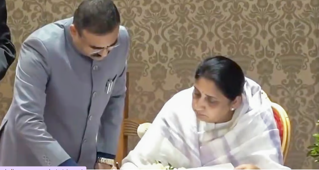 Maharashtra Governor Acharya Devvrat administered the oath of office to Sunetra Pawar in the presence of Maharashtra Chief Minister Devendra Fadnavis and Deputy CM Eknath Shinde.
