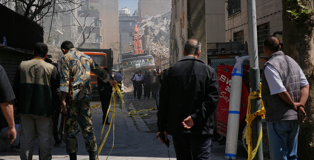 Bystanders watch from a distance as rescue teams and first responders work at the site of a strike that, according to a security official at the scene, destroyed half of the Khorasaniha Synagogue and nearby residential buildings in Tehran, Iran, Tuesday, April 7, 2026.